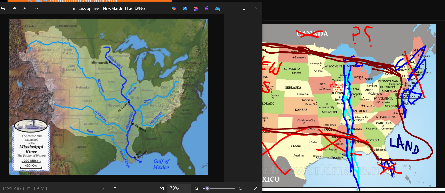 Notice the Mississippi river is in Minnesota and ends up in around Louisiana. The new prediction map shows it starting right under the Great Lakes and moving straight down to the gulf through Mississippi and Alabama. Adding a second Mississippi river several hundred miles to the East. Or what would be more devastating is if it combines with the existing Mississippi River and washes out all the land in between.